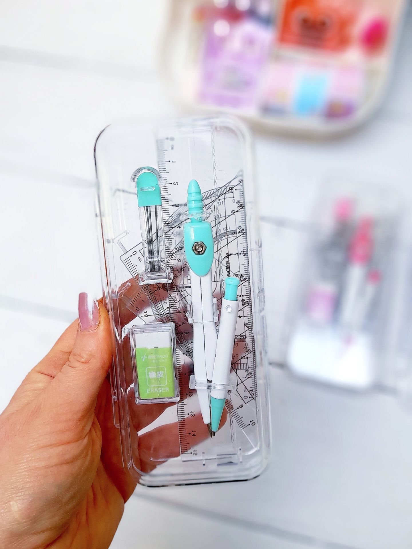 یه جعبه طلقی شیشهای که داخل ۲تا گونیا، ۱خط کش، ۱نقاله، پاکن، مغز اتود، با پرگار بدنه فلزی. پرگار به صورت اتودی میباشد.